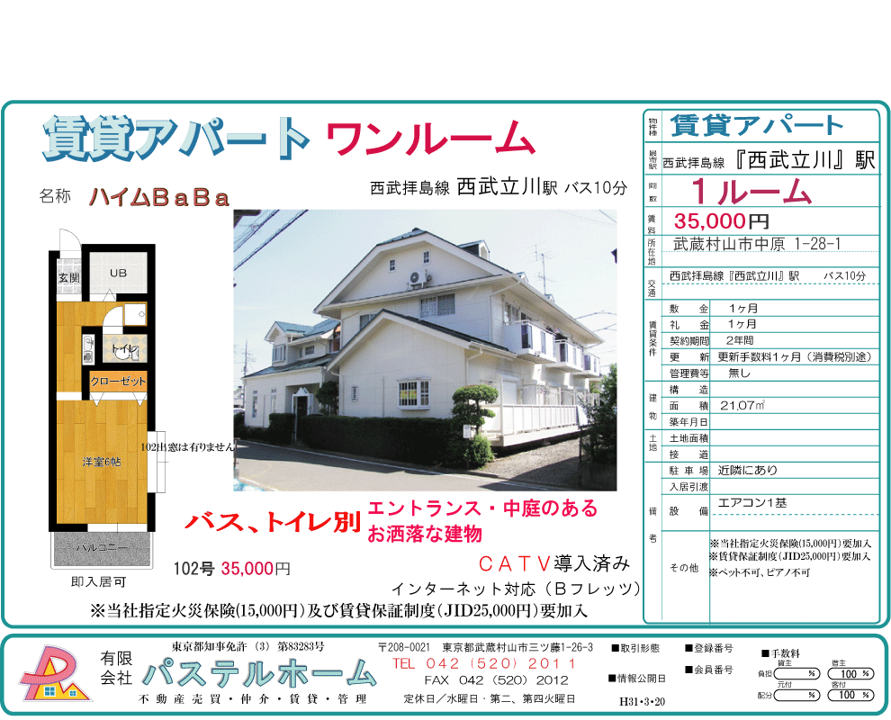 【交通】西武拝島線「西武立川」駅 バス10分 徒歩2分