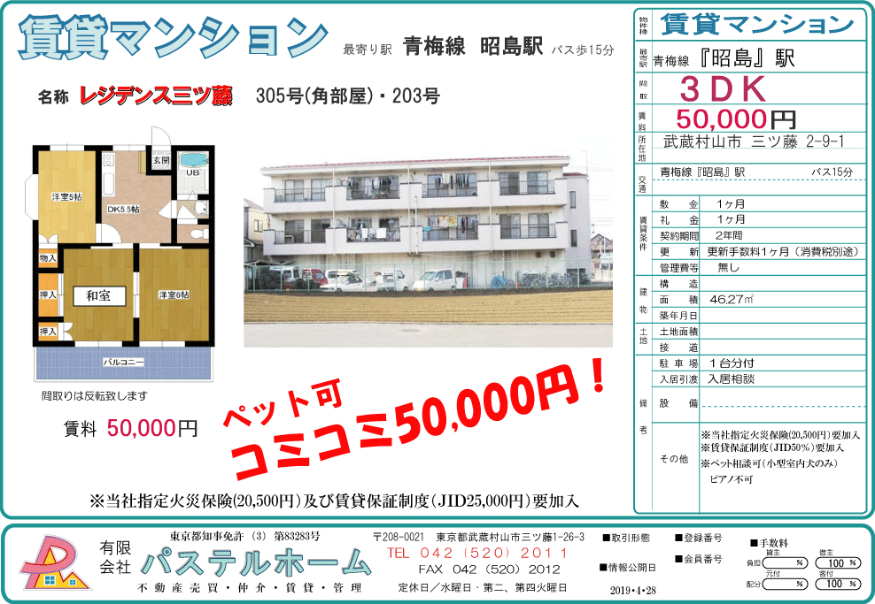 当社指定の家財保険(20,500円)、賃貸保証(50%)にご加入願います。
